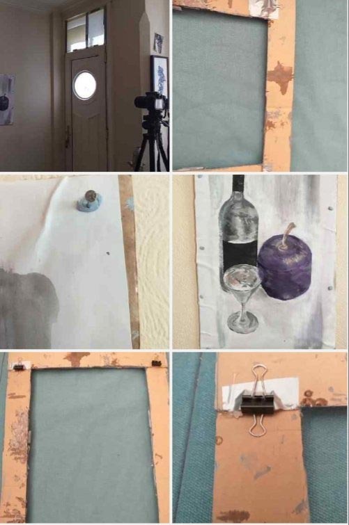 I attached the frame with small bulldog clips and gaffer tape. Measured and marked with blue tack then nailed the painting onto the wall and then attached the frame.