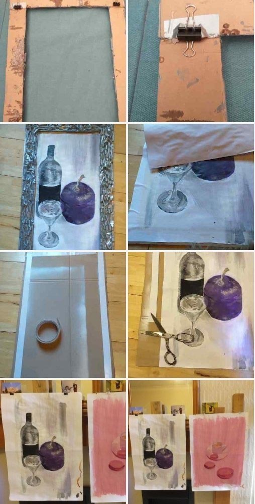 I attached the paper paintings onto cardboard with double-sided tape to make it solid and trimmed it to fit the frame.
