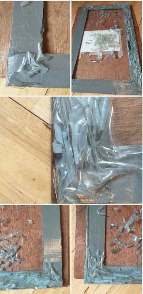 The frame measured to fit on top of the canvas. Originally I thought to staple gun the frame to the canvas, but it will go hard when I coat the plastic in resin leaving it difficult to attach without seeing the staples . I think using gorilla glue will work as a solution. It may be a blessing as it will be seen on a digital platform so the crude assembly should be less obvious.