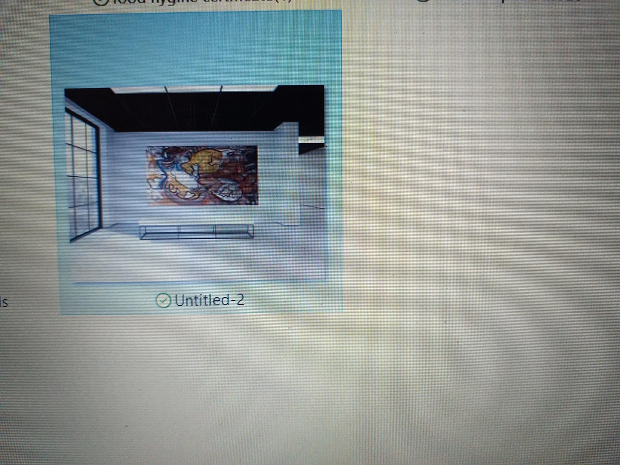 Rather than photographing them on the wall at home or at the studio because of poor lighting etc, I decided to experiment on photoshop by placing images of my work into a blank gallery space. However as my skill set on the computer is very limited I have found it a challenge to place the painting images onto a gallery background. The problems I face is to get good quality images at a correct size to look realistic in the gallery setting and also to save them as a reusable images. From a professional view point I feel the images of the paintings are crude and out of focus and there by not doing justice to the colours or textures in the paintings