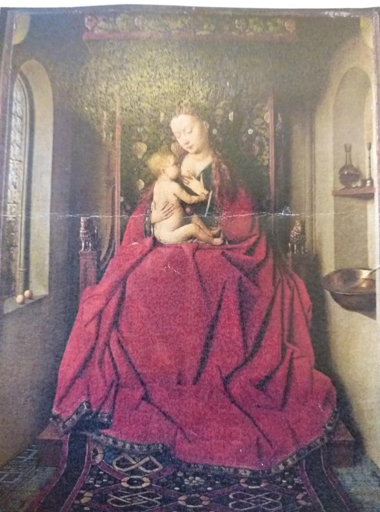 Clothes: Typical for northern Renaissance, Mary is covered from head to toe in lavish clothing that does not coincide with the traditional Mary in the Bible, who gave birth to Jesus in a manger.